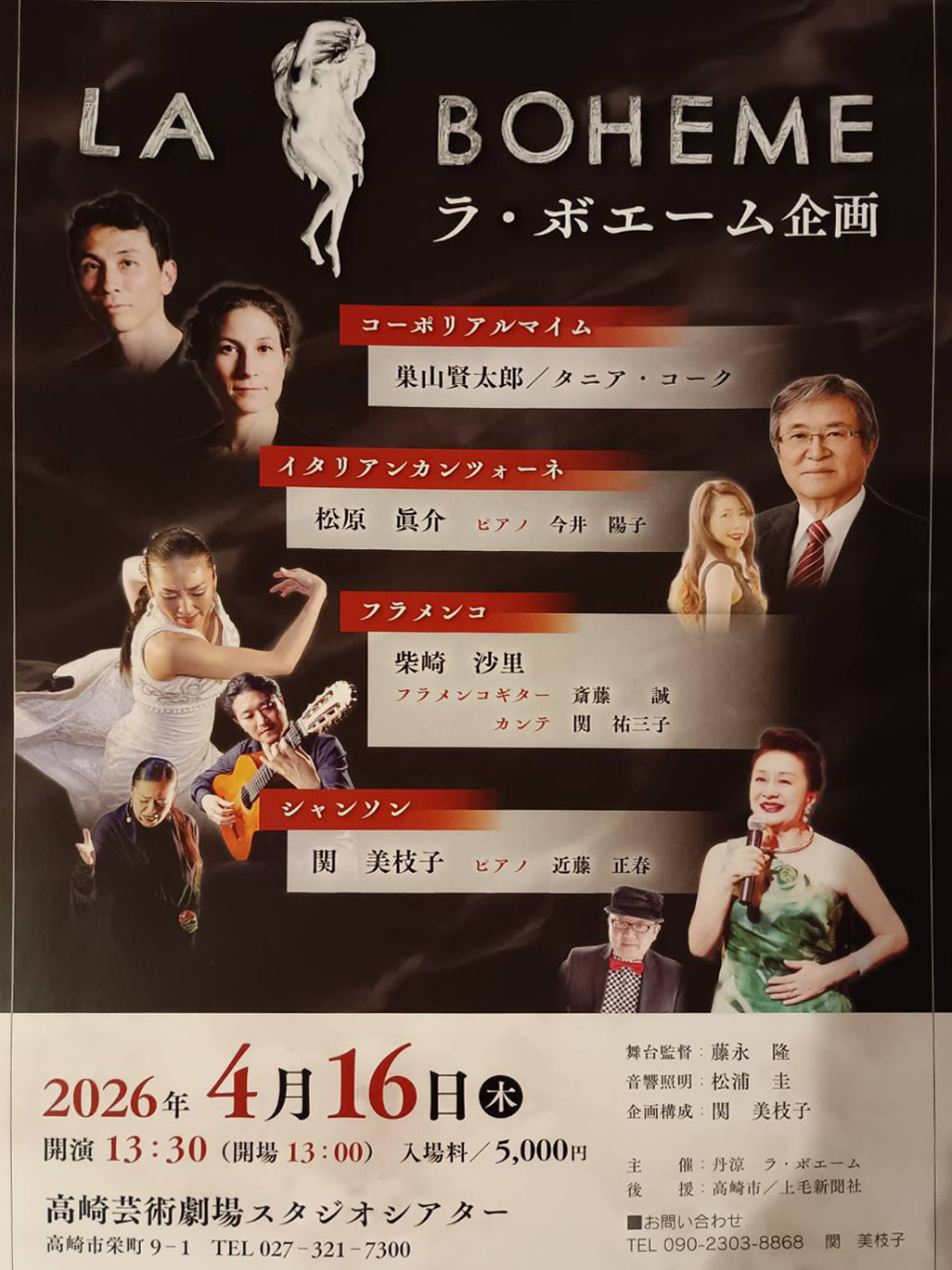 独自の身体表現で魅せるコーポリアルマイム(巣山賢太郎/タニア・コーク)をはじめ、心揺さぶるイタリアンカンツォーネ(松原眞介)、情熱的なフラメンコ(柴崎沙里)、ドラマチックに人生の彩りを歌い上げるシャンソン(関美枝子)。 それぞれの分野の第一線で活躍する表現者たちが、高崎の地に集結します。